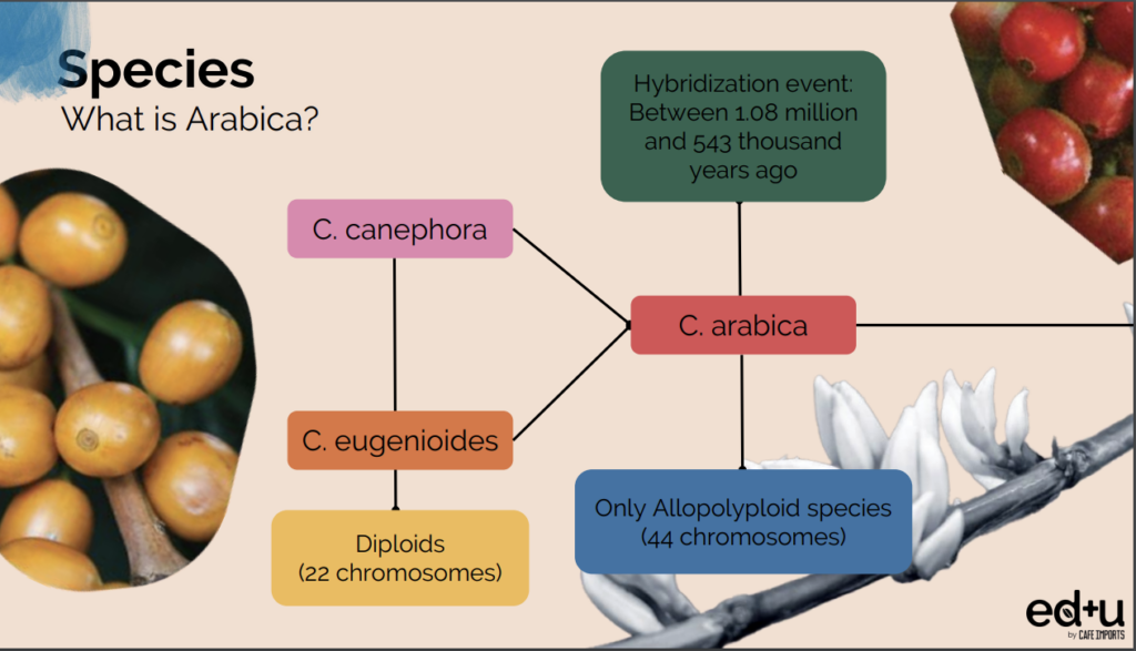 아라비카는 단순히 자연에서 발생한 품종이 아니라, 두 다른 커피 종인 Coffea canephora(로부스타)와 Coffea eugenioides의 자연적인 하이브리드(hybridization)로 탄생한 커피입니다.